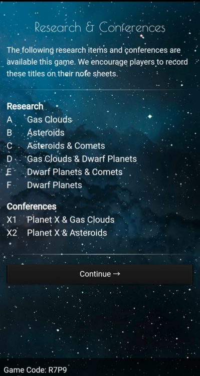 The app will now provide the Research & Conferences that are going to be available for the game. This is general knowledge for all players and should be shared and noted on the player sheet in the section with the same name. Once that has been captured the game will present the player with the options available on their turn.