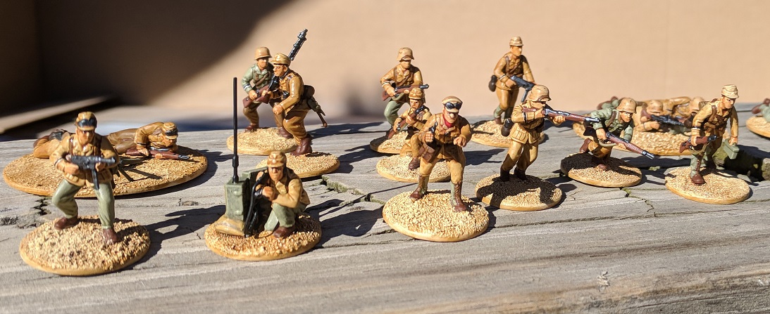 For my DAK force, I wanted to model things a little later, when supply lines were starting to be an issue and the uniforms were changing over from the original tropical green (with pith helmets!) to brown and tan with cloth caps and stahlhelms. As such, I painted them with a varied, rag-tag appearance using a method that I wrote about here. I used the 1942 Light Afrika Division as my list selector. Given that the Germans pressed nearly 2000 former members of the French Foreign Legion into service in this division (specifically in what would become the 361st Infantry Regiment), many of the men comprising this division were both a) not actually German, and b) seasoned veterans.