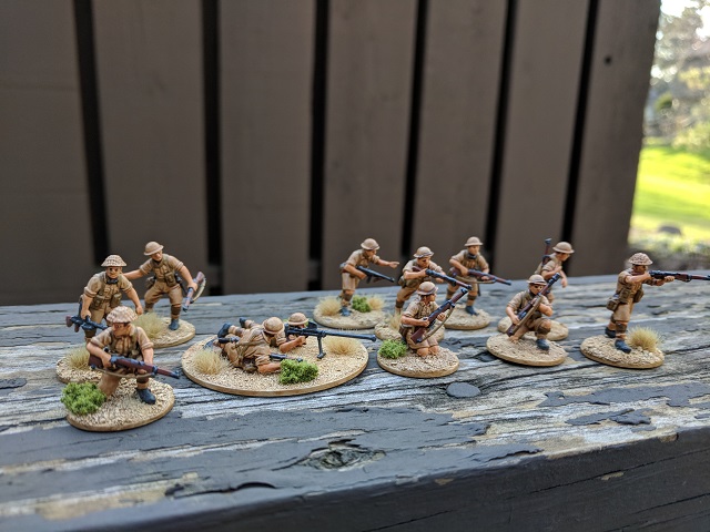 For the 8th Army, I went with the 1940-1942 Commonwealth list, as much of the 8th army at that time was made up of Australians, New Zealanders, Indians, and South Africans. The Perry box again gives you enough to do an officer and 3 full squads each with an NCO plus 9 men (one of which is carrying a Bren). Additionally, you have the parts to do a 2” mortar team, a Boys anti-tank rifle team, and a radio operator that makes for a great Artillery Forward Observer (the latter of which the Commonwealth list gets for free!). Perry also makes a great 2-pound anti-tank gun, so I added one of those to my list as well. The 2-pounder is very much a light AT gun, so don’t expect it to tear up enemy armor with reckless abandon, but it is very fluffy to the period. The 8th Army was highly mechanized in North Africa and had oodles of transport capacity. You can put this force in any combination of various trucks or Bren Carriers. Carriers can only take 5 men but come with a front-facing LMG and can be fitted with an extra pintle mounted LMG for another 10 points. If you want to zoom all over the board and blast people with machineguns, this kind of force can be good for that. Better still, a friend 3-d printed my carriers for me from a pattern he found on Thingiverse, so they cost me something like $0.74 cents each in resin.