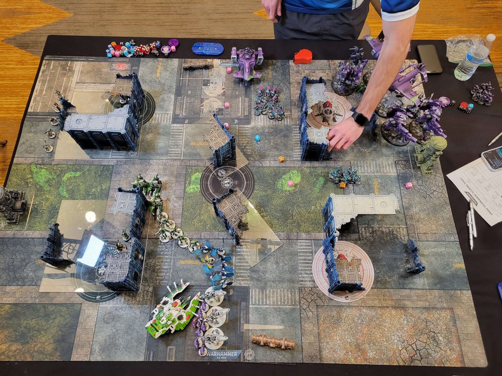 In any case, Matt was very gracious as I got to the table. He had every right to be upset but was instead very understanding. We quickly walked through each other’s lists and discussed some of the key strats and abilities, and then hustled through setup, deployment, and starting the game. His secondary selections were strong with a good chance of maximizing all three – mine were a little bit more of a hail mary. Harlequins are a nightmare matchup for Craftworlds; their output is perfectly tuned to killing T3 elves and their speed is superior. If the save rolls start hitting above average or at critical times, it’s unlikely the Craftworlds can punch through enough damage before getting swept – I needed to hit his Starweavers hard and early to pin him down and create the space to score my secondaries.