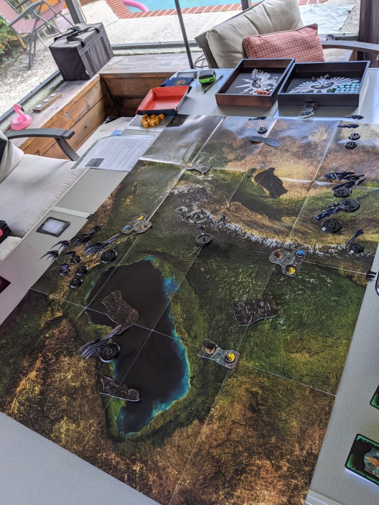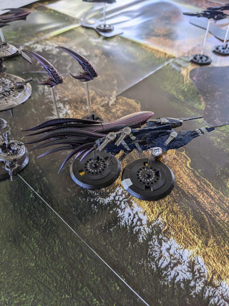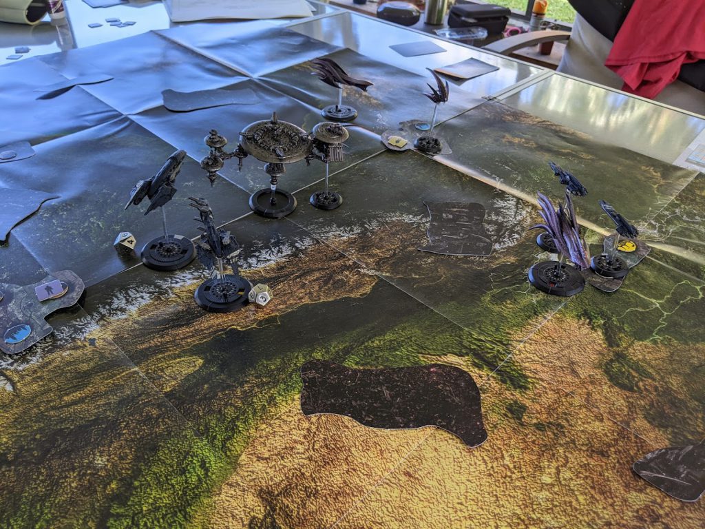 One of the coolest things about Dropfleet from my perspective is how it handles deployment: while some scenarios will recommend that your fleets are deployed on the table, most will begin with your ships starting off the table, then moving on from your board edge on a given turn based on the deployment rules you’ve chosen. For this match, we went with Battlelines, which just means that everything starts off the board, but all comes in the first battle round in normal activation order.