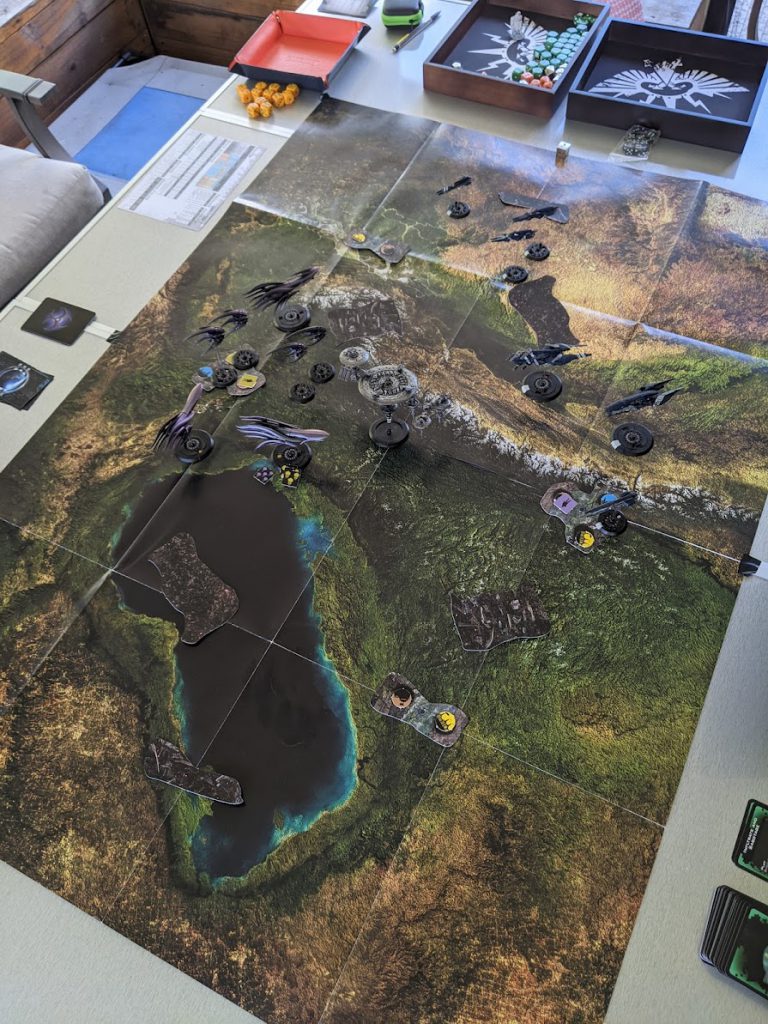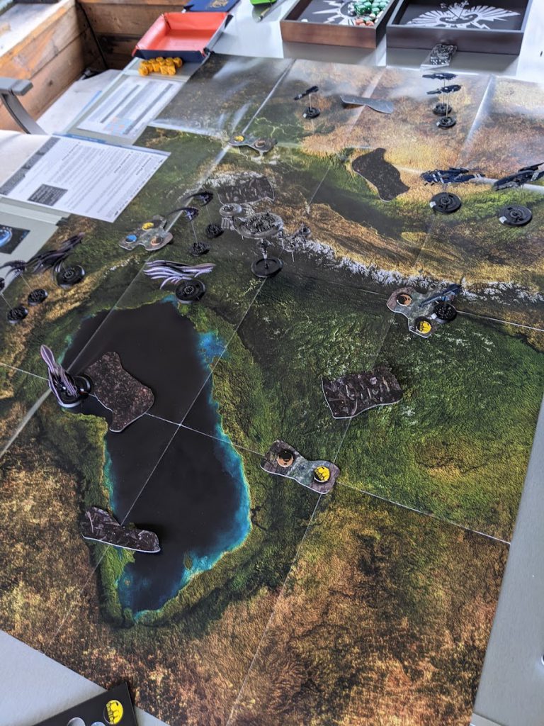 Thankfully, he missed. I pushed my Seattle up and managed to clear one of his Strike Carriers off the board, leaving us roughly at parity - I had one more frigate than he did and had managed to cripple his Shenlong, finally getting rid of the Partial Cloak rule, but the Shenlong retaliated by tearing into my Taipeis while his Hydra’s bomber wings slowly picked apart my larger ships.