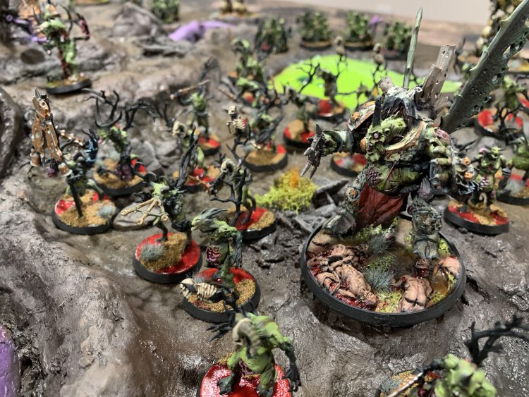 As Lance and I sipped our coffee next to my giant-ass display board, I started to realize that there is no world in which I could navigate three rounds of a crowded banquet hall while toting this son of a bitch around. I was going to need to try and get it judged in the few minutes before the round starts. Luckily, I spotted a red-shirted judge who was in the middle of another army's judging not too far away. I politely hovered near him, waiting for him to wrap up before awkwardly trying to explain that 1) I'm a complete newbie, 2) I'm also an idiot for making my display board too big and 3) I'd really appreciate it if he could come to judge my stuff so I could put my board back in the car. He seemed to understand and was cool about it, so he came over to score my stuff. I had no clue if I should walk him through my army and try to explain how everything is Nurgle-aligned, or if that would be weird to influence his judging. At the RTT's I've been to, I just left it up on the judging table and walked away. But for the GT, they place so much prominence on the army theme that I had typed out some background information for my army. I ended up deciding to at least point out the printed pages of fluff and then awkwardly pretend to look at nearby armies, all the while trying to see what marks he gave me for each point of the rubric. Lots of 5's and a few 10's out of 15. Hmmm, what's going on? As he wrapped up, I decided to ask if he had any feedback for me. He did and pointed out some inconsistencies with my basing and the board, which is fair enough - they were off a couple of shades, despite my best efforts. I decided not to push it for all the details and as a result, didn't realize it at the time (but did after the event when I asked for clarification) that the theme score was mostly visual. I had thought list components factored more into it as well, like the fact that everything in my list was Nurgle-aligned. It didn't count for nearly as much as I expected. I had misunderstood the rubric and as a result, had massively missed the mark on theme scoring.