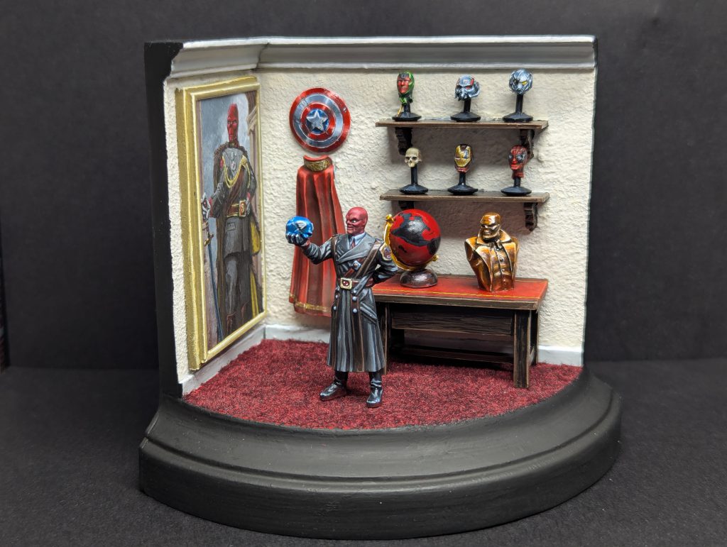 The original Red Skull miniature features the Cosmic Cube in his hand. I cut this out and replaced it with the helmet of the original Captain America miniature. This required carving out his face and resculpting Red Skull's fingers. The walls, shelves, table and globe were all painted from scratch. The "masks" and heads on the shelves were all character heads from their respective models. The portrait on the wall is a freehand recreation of the Red Skull portrait from Captain America: The First Avenger.