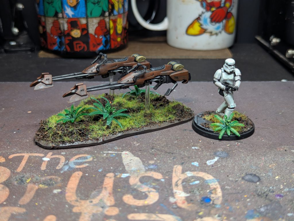 I used a pair of Scout Trooper speeder bikes from Legion, which were laying around unassembled. I left the Scout Troopers off of them and modified the grips to get rid of their hands. Now it looks like a paid of speeder bikes hovering in place, waiting to be used.