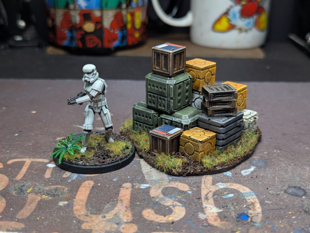Previously, Fantasy Flight had released a small terrain set of cargo boxes. I had bought some for Legion and after I was unable to find more, I made a silicone mold of them so I could reproduce as many as I want. While digging for other things, I found them in a drawer and decided to stack them up into piles. One for Endor and one for the desert terrain. They compliment the official Shatterpoint ones well, since they are different sizes. The mold has long since disappeared, but I'm glad past me made these up for sure.