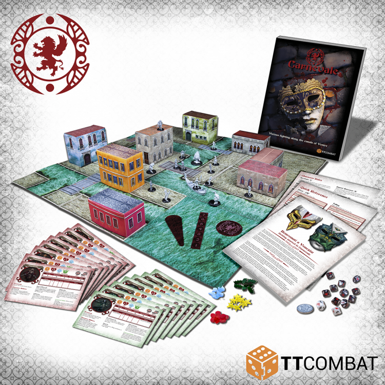 Published by TTCombat, Carnevale is a narrative skirmish miniatures game where each player takes control of a small handful of miniatures (usually around ten) representing one of the factions fighting for control of Venice. The unusual architecture of Venice is used to full effect, with canals and buildings playing an essential role. Characters will climb, jump and swim around the board to find an advantage as they battle it out.