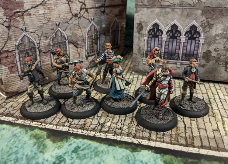 hidden blade sword. The gondolier is a good ferryman who can help speed up transit around the board (necessary when fighting the fast-swimming Rashaar) and the fishermen are both expert swimmers and specialists at taking down big monsters. The combination works really well and gives a lot of clear tactical options - the citizens to hold the line, the fishermen to tackle the monsters, the gondolier to help get everyone where they need to be and the Capodecina to run across rooftops and then jump off to stick a blade in the magi-rashaar who leads their foes. The Rabble Rousers are a great complement to this, adding some ranged punch in the form of the Arbalest and the two recruiters, who also enhance the citizenry further. You also get an extra citizen to add into the mob, and a gondolier for