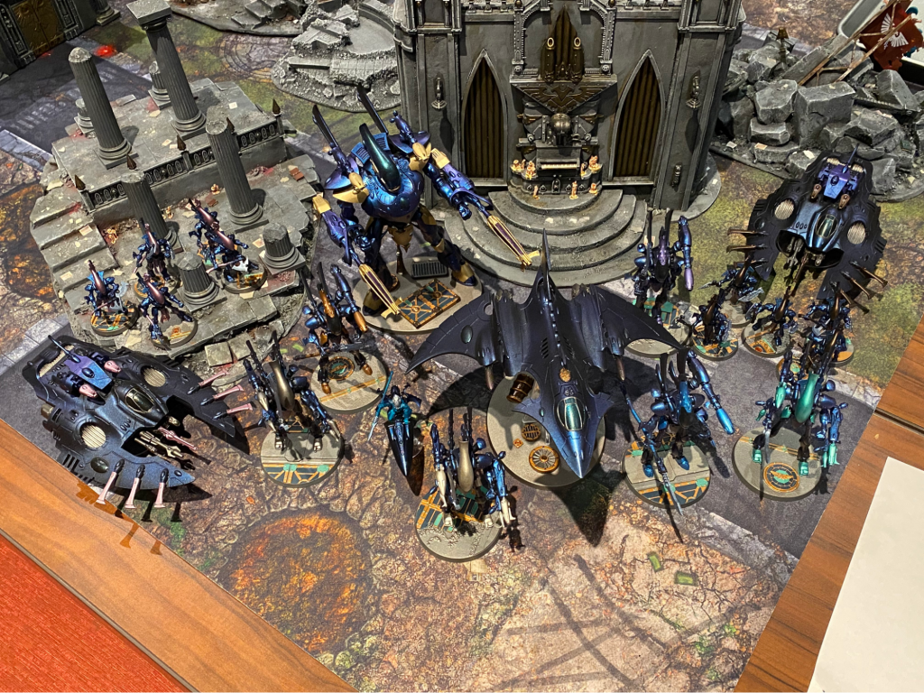 I (Joe) ran these funky blurple zombie elf robots at the Goonhammer Open US Narrative event, and had a lot of fun with them. I even managed to not get completely mutilated in most of my games. This is an army that just flat out does not work in most GT missions, for reasons that range from starting down 4 CP without much upside to having a total of 18 models in a 2000 point list (Objectives? What objectives?). What they can do is kill the absolute hell out of things and look good doing it. Plus I got to use the Hemlock Wraithfighter and the Skathach Wraithknight, two of my favorite models in the Craftworlds line.