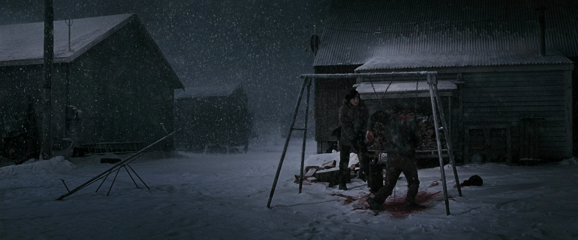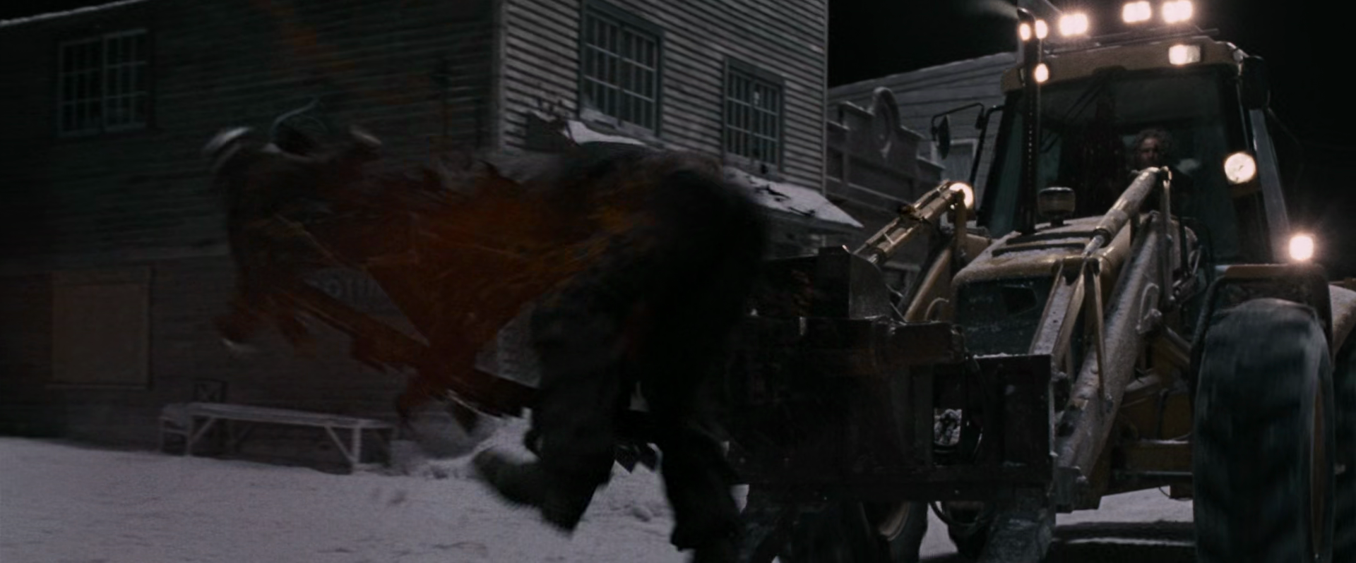 A lot of how this movie is shot feels stage-y, and that’s wholly to its benefit, I think. What it’s really doing a lot of the time is recreating panel framings from the comic, shots that fans will remember and that director David Slade enjoyed. This was a fad in the 2000s non-superhero comic movie boom; the obvious leaders in the space are Zack Snyder’s 300 and Robert Rodriguez’s Sin City, both based off of Frank Miller comics (in both cases they tried to give him co-director but that’s not how their union rules work; Rodriguez quit the Director’s Guild so that the co-credit could stand). At the time I remember not liking the trend but now I’m perfectly fine with a camera that frames a scene and knows what it’s doing, and either stays put or moves in a consistent direction on purpose to accomplish a task. I’m fine with a general store set that’s clearly a set with clearly theatrical snow blowing past the windows. The contrast you can create between the white of the snow and the shadow in the unlit store is great in 2025. Every movie I’ve had to watch for the past month and a half for this feature was shot like a CW show with too much CGI budget.