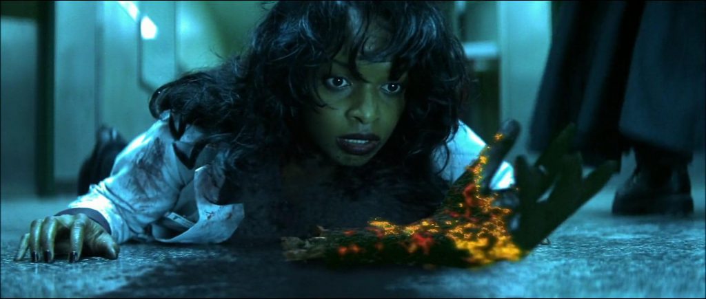 Karen, the mortician and blood scientist, ends up being one of the movie’s most interesting characters, and has shades of a prime 1970s Pam Grier character about her. She’s a quick study who takes to murder almost immediately, and her enthusiastic competence positions her far more as a sidekick or co-lead than a romantic interest. This woman could have been a stock femme fatale/damsel archetype, but Blade (the movie and the character) never shows the slightest interest in sidelining her for that. She cures her own vampirism, and for good measure also develops a somewhat more vigorous cure, that works by making your blood explode. It’s just too bad she never shows up in the sequels.