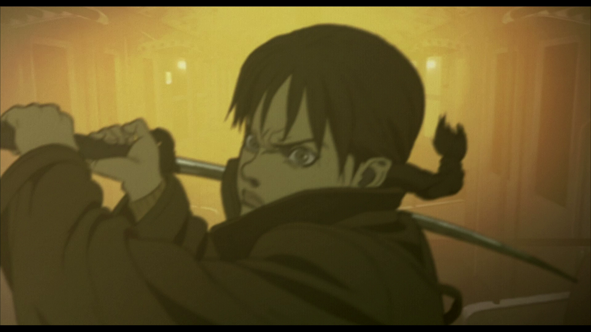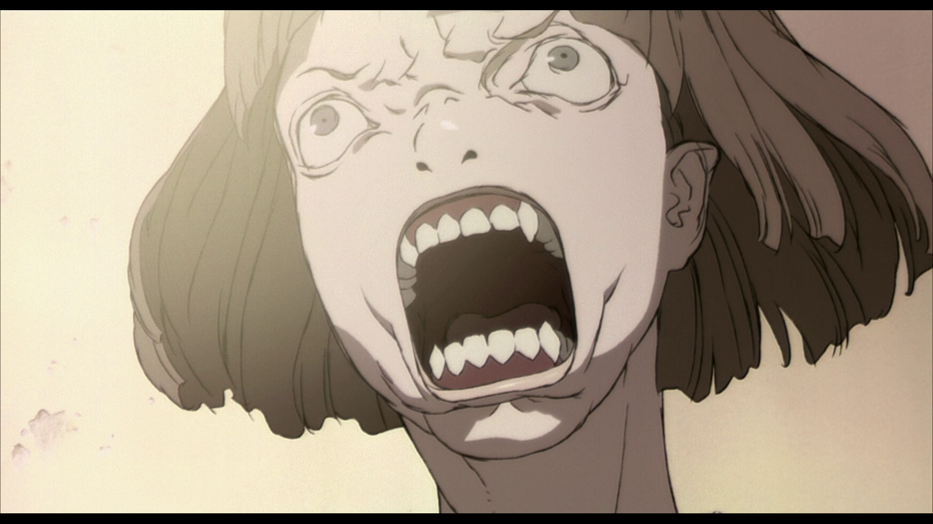 But here and now, it’s pretty great. The animation wears the use of early CGI proudly on its sleeve, even giving 3D CGI director Tokumitsu Kifune front billing along with the traditional art direction in the opening credits. This was in the days before “CGI” had a negative connotation in animation and, to be fair to the project, it uses it quite well for vehicles and light sources, with a washed out old-timey color palette that both communicates “the past” (our story takes place on a US airbase in Japan in 1966) and allows the animation to blend with the computer graphics much more easily. The use of CGI on much of the environment frees up the animators to pay a lot of close, specific attention to the characters, such as the number of distinct animation frames of both the gun and face of Saya’s handler David as he reloads in the middle of the fight in the motor pool before firing at one of the vampire-demon “chiropterans.” They didn’t need to spend that much effort on something most teams would simply skip altogether for budget reasons -- both of time and money -- but in putting it in there, they communicated that David was both comfortable with his gun and on the edge of panic; a trained and experienced veteran nevertheless not wholly used to the kinds of fights he was getting into now.