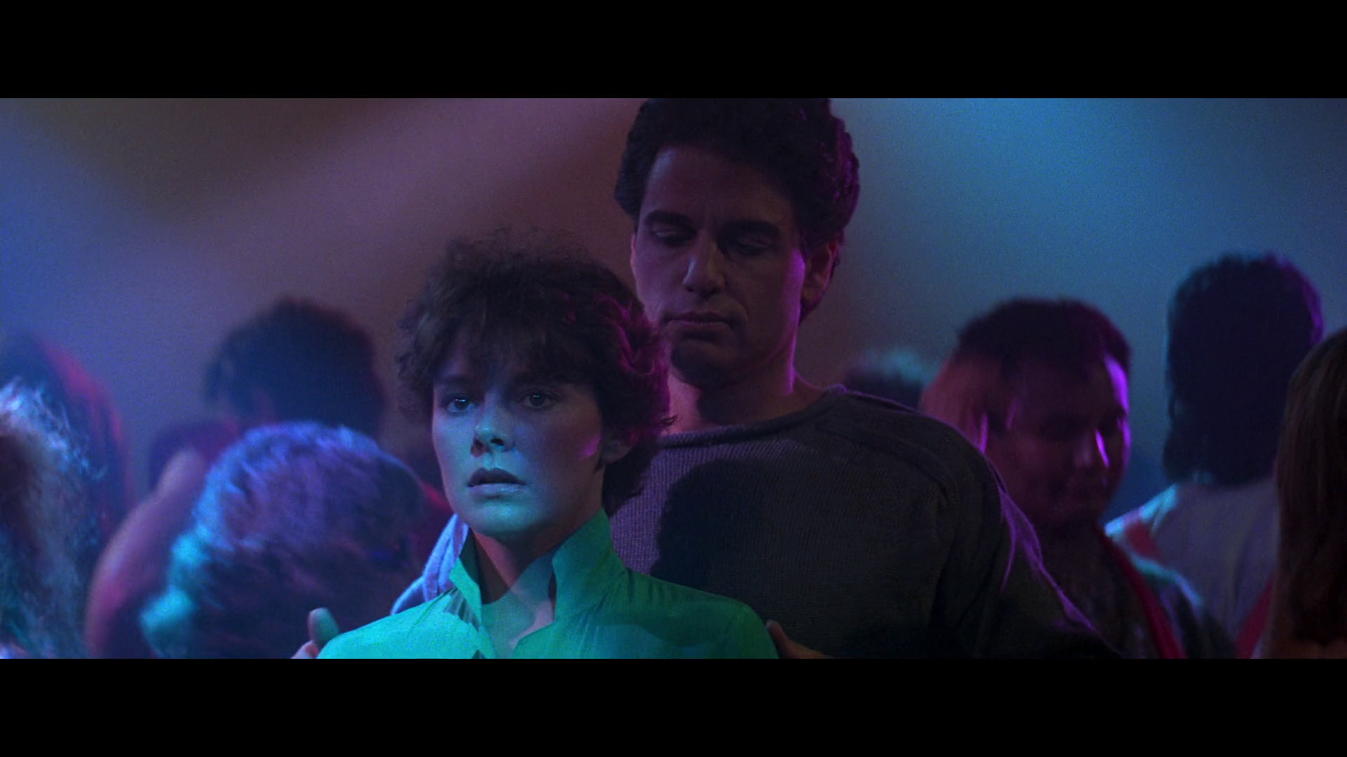 The third big part of the pivot, after Vincent learning vampires are in fact real and Dandrige obsessing over Amy as his Lucy/Mina/Ellen figure, is Evil going from goofy sidekick to Dandrige’s new vampire disciple, which immediately feels correct; the character was gravely out of place in the teen comedy section of the film, but now that we’re sneering at old men about immortality and wearing gross face makeup, this guy makes perfect sense. There’s a great sequence here where Dandrige pursues Charley and Amy through the darkened streets of Anytown, USA in his big white trenchcoat, face emotionless like Mr. X from Resident Evil 2. They eventually duck into a nightclub -- we’re a few years past being able to call this a full-on discotheque, but that is the vibe -- and after some comedy bits with the nightclub chef (?) chasing the kids through the dance floor, we get another big Dracula milestone in this retelling: The Seduction of Mina by the Vampire Dracula. Of course, since this is the Eighties in America, their names are Amy and Jerry Dandrige, and they look every inch the part.