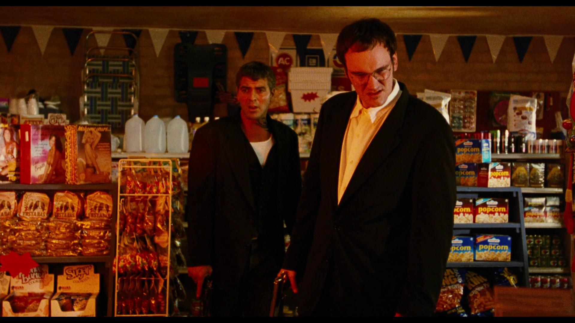 This would have been much better when I was fourteen, mainly because I wouldn’t have seen the other Quentin Tarantino-written films that did this schtick better, like Jackie Brown and Pulp Fiction (didn’t get around to those until like freshman year of college) or the other Robert Rodriguez-directed films that did this schtick better, like El Mariachi, Desperado, and…well, this is a cut above Once Upon a Time in Mexico, come to think of it. The high point of the first hour and change of the film is the opening scene, where we get basically both creative minds’ whole deal distilled down real pure: A shithead Texas cop walks into a liquor store, takes a beer from the fridge, orders a bottle of whiskey from the backstop, and shoots the shit with the clerk about a mentally-disabled man who cooked his breakfast in terms that make you think actually both of them are kinda shitheads, even when adjusting for era with the nineties. That’s so you don’t feel bad when our two slick bank robbers, both in suits and holding guns to the heads of two young women wearing tank tops without bras, shoot one of ‘em in the head and set the other one on fire in the ensuing shootout. This is all because one of the two cool guys in suits is a dangerously deranged, pathetic moral void (not the one played by George Clooney). It’s grimy, fun, effective, has the sort of real kick-it-to-eleven cartoon quality you expect from a Robert Rodriguez fight scene; they empty like 30 bullets into this liquor store clerk who was genuinely trying to keep it so everyone got to walk out alive, and then on the news in the motel room later, the attractive blonde anchor smiles as she reports on the liquor store’s explosion and the graphic displaying the two brothers’ body count dings and goes up like a gameshow.