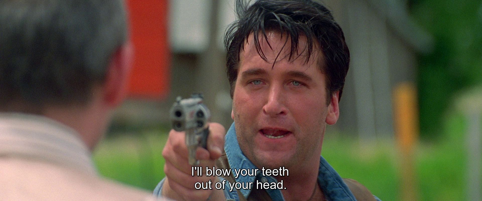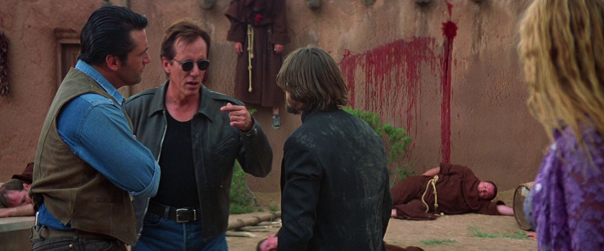 And boy howdy are they dirtbags. Our two male leads are balding, rail-thin and grimacing scarecrow James Woods and sweaty, jowly, and perpetually leering Daniel Baldwin; Woods is a year off from Disney’s Hercules, and that will remain the role that defines him. He’s not a thriller lead; he’s not an action lead -- Carpenter knew this, and this is part of why he cast him, because he didn’t want a guy who looked like Arnold. He also wasn’t his first choice. Woods’s Jack Crow manages to feel authentic to the sort of disposable piece of shit you pay off the books to go do violence in the American Southwest when he’s slapping around women, beating up priests, and throwing around slurs, but when the tragic backstory crap starts up, none of it works. I’m willing to bet none of it worked in 1998, either, because a glance at his resume says this is the last time he got to lead a film. Baldwin’s character, Tony Montoya, spends most of the first hour waving around an oversized big boy revolver, sleeping off hard liquor, and doing various rapist shit to Katrina (Sheryl Lee), a vampire-bitten sex worker that the two men kidnap; once he himself gets bitten it actually turns him into a more sympathetic character, and Baldwin’s performance consequently becomes less authentic and more wooden.