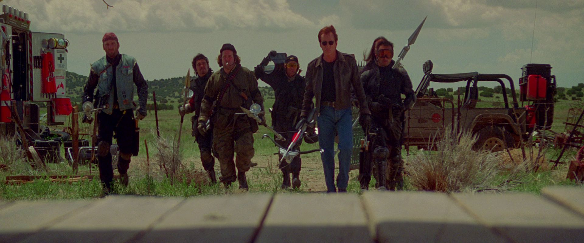 The action is serviceable for its time, meaning it’s not so great; no one’s ever going to mistake Woods or Baldwin for kinetically-gifted actors, and the servant vampires, which are amusingly called “goons” as a term of art by the hunters, have an entirely leap-based sort of offense to them. They’ll do a big supernatural hop, landing either on or, bafflingly, in front of whoever it is they’re trying to attack or bite, and then everyone sort of tussles around for a moment before the vampire either throws their victim into a wall or the ceiling or hops away. But there are a lot of fun props in the vampire hunter toolkit for Carpenter to deploy, from Crow’s silver pneumatic harpoon crossbow, to these big polearms wired up with cross spears at the top and UV lights wired to a squeeze handle on the grip, to all manner of prop guns and body armor that Carpenter probably still had lying around from the Escape movies. They have a great hunter SWAT van that we only really get to see in action the opening sequence of the film (done up with a logo and everything, because the film was still toying with the idea that these guys were private security contractors but for vampires), but Carpenter seized on the idea of using harpoons and winches and a Jeep to drag vampires screaming out into the sun to explode, and that has a fun enough payoff once the film gets down to it in the final action sequences. The fire effects are particularly good in that practical way Carpenter always nails; he does specially-formulated chemical burns to make sure the flames are always sickly green or too-red whenever one of the vampires goes up in sunlight, reserving mundane orange wood-burning fire for when buildings are set alight.