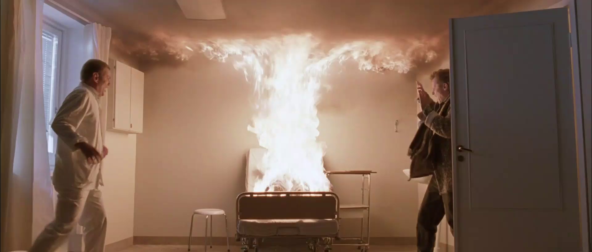 Understandably, her husband wants revenge. He manages to track down Eli -- he’s no grand vampire hunter, but they’ve been extremely obvious this entire time -- and tries to kill them while they’re sleeping in the bathtub during the day. Oskar confronts him with a knife, which causes him to turn away from the vampire tween…and they awaken, jumping him from behind. As the man struggles, Oskar quietly pushes the door to the bathroom (almost) closed and walks away. His first assist. When they’re finished, the vampire comes out, covered in blood, and Eli, who has been doing this a long time, knows that now is the moment to seal the deal with a kiss. He’s theirs now. Eli acts like they’re leaving, but there’s one more thing to tie off of course -- the bullies. And when they corner Oskar in the school pool and try to drown them, Eli returns to kill them out of hand. He leaves home that night. The next and last scene of the film is them on a continental train, Oskar in the open on a seat, Eli in a great traveling trunk, tapping sign language to each other: KISS. Eli has their Renfield.