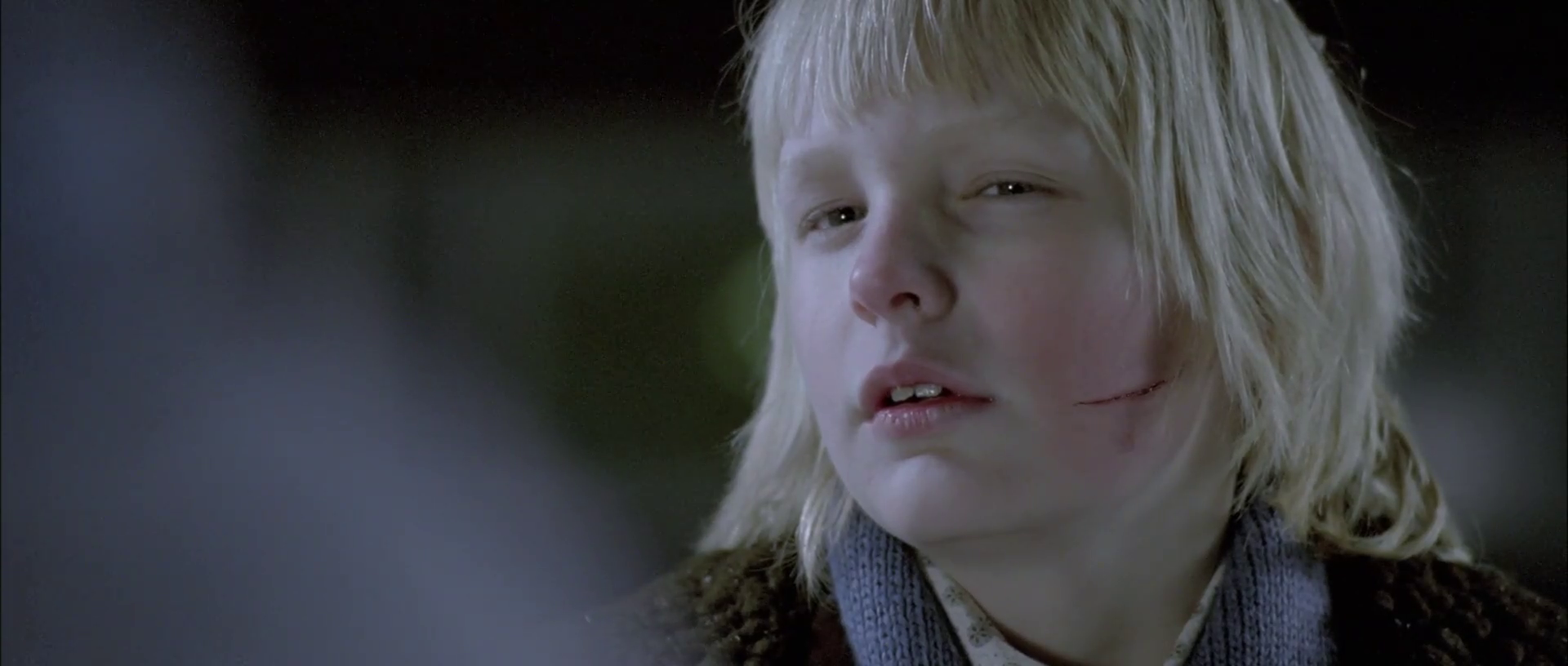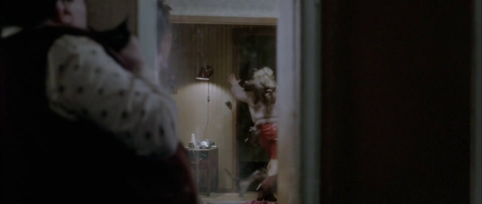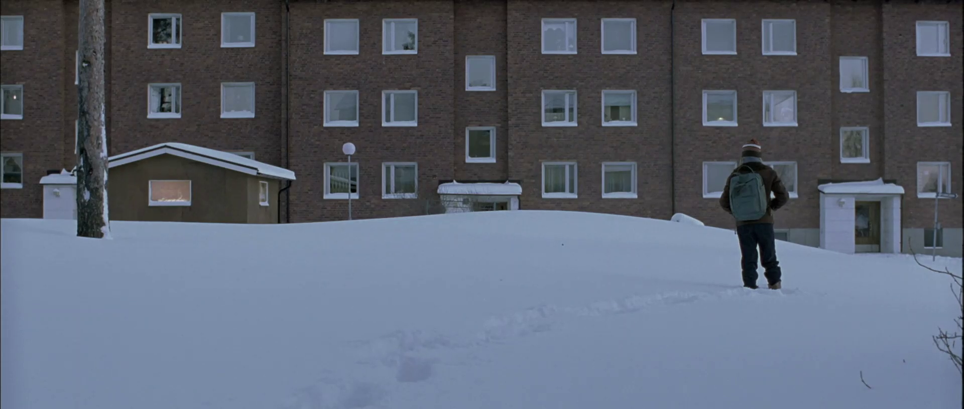 Director Tomas Alfredson does a fantastic job blunting that fundamental truth throughout the runtime; it’s a fantastically shot film, quiet and calm, with very little rushed action. The one moment that would intuitively be a big action setpiece -- the brutal murder of the bullies at the swimming pool in the film’s closing minutes -- is filmed entirely in static frame, looking Oskar in the face as he tries to hold his breath underwater. The action proceeds entirely through the muted, warped sounds of Eli killing the bullies above, the feet of one of the bullies kicking through the water in the background as he’s dragged down the pool’s length, a head falling into the water behind Oskar, and eventually the hand holding his head underwater being torn from its arm at the elbow. Incredibly effective, very brutal, leaves most of the actual violence to the suggestion (and budgetary constraints) of the viewer’s mind. The actual big action sequence in the film is when the woman bitten by Eli, who is turning into a vampire, visits her husband at a friend’s house with a lot of cats -- and they all attack her as she flips out in her bloodlust. This scene is less successful, mainly because it has to employ 2008 CGI housecats as primary actors, but it is fairly amusing.