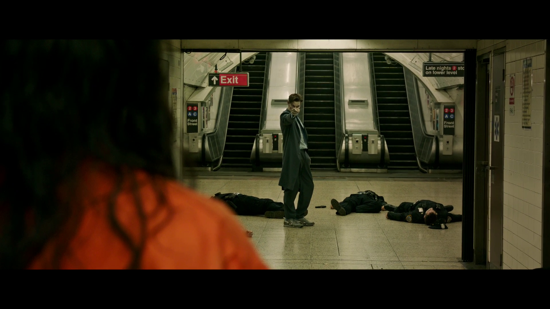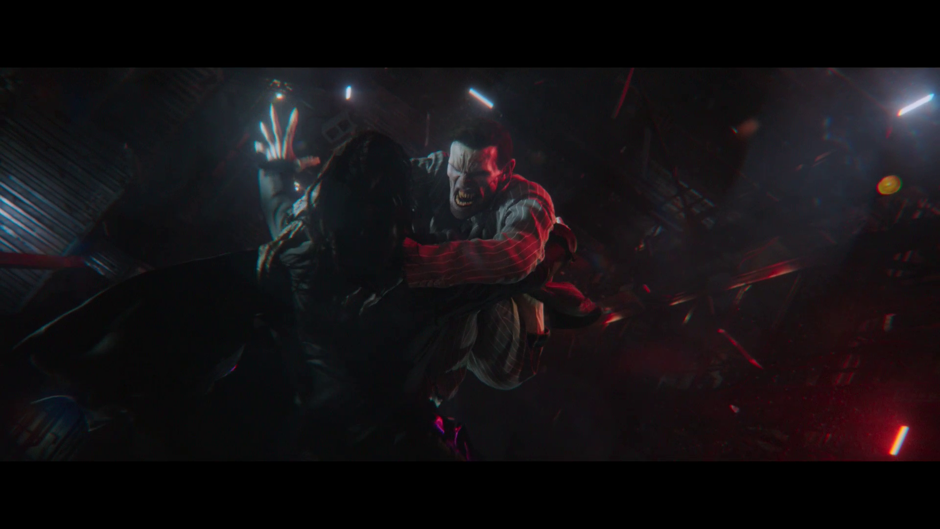 This is the best stretch of the movie by far, starting with the nurse kill and going through what happens next, which is that Morbs figures out the play and instead of coming up with a clever plan to sneak out of jail or counter-ruse Milo, he simply smashes his way through the barred window and flies out into the night, flexing his own vampire superpowers. Milo, who is expecting Morbs to do this, has been marking time by killing a newspaper vendor who he baited into saying something vampire-phobic to him, as you do. They face off, do the requisite, “But I was your brother!” bickering, then head into the subway for the best scene of the movie, a slugfest where both guys are basically just Superman-type “they’re really strong, they can jump a lot, they’re tough, they punch real hard” bruisers but everything has Vampire Seasoning sprinkled over it: Lots of threatening purple auras and echo-location CGI and weird eyes and teeth and claws. Milo kills a bunch of transit cops. It’s pretty solid stuff! If you wanted to see what combat Disciplines from the World of Darkness tabletop game Vampire: The Requiem looked like done up with a full budget, this movie’s got Celerity, Vigor, Resilience, Protean, Auspex, and by the end Animalism all on full display -- for this scene, the final fight, and maybe one or two other brief spots. The rest of it is a lot of Jared Leto trying to carry scenes.