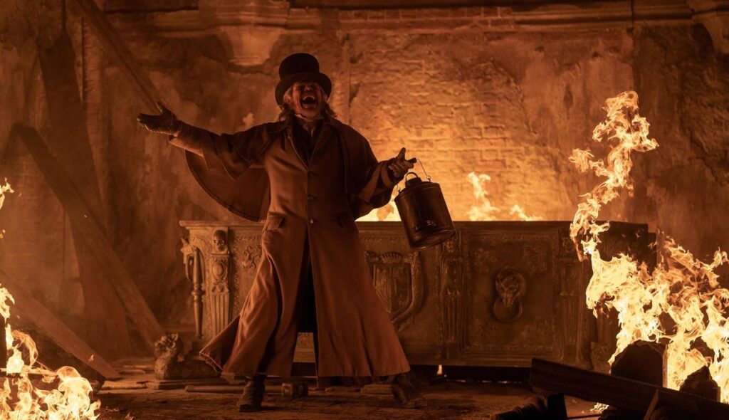 There are some other great performances in here; the leading men do their jobs well but aren’t the standouts, not even Skarsgård, who is now an old hand at this kind of heavy prosthetic movie monster work. No, it’s the old-timers who really punch this thing up. Willem Dafoe’s Professor Albin Eberhart von Franz, an Abraham van Helsing-like character leaning firmly into the old occult crankery of that archetype, has excellent fun capering from sickbed to asylum to morgue to cemetery and back around again, dispensing vampire lore and explaining the plot to the initially irritated, then horrified, then dead Harding family. A bit less central to the movie’s marketing but no less entertaining is Simon McBurney as Knock, the Nosferatu story’s take on Renfield, the real estate broker who in one of the movie’s first scenes is uncommonly chipper and happy to see a flustered Thomas Hutter who has turned up 15 minutes late for a job interview -- because, as it is revealed, Knock is a fully and delightfully mad devil-cult ritualist who incorrectly believes he summoned Nosferatu into the world through his vile works and has conspired to dispatch young Hutter directly into his master’s claws. His task concluded, he goes completely, openly off the deep end, shutters his business, and starts biting the heads off pigeons and cutting the throats of livestock in the streets.