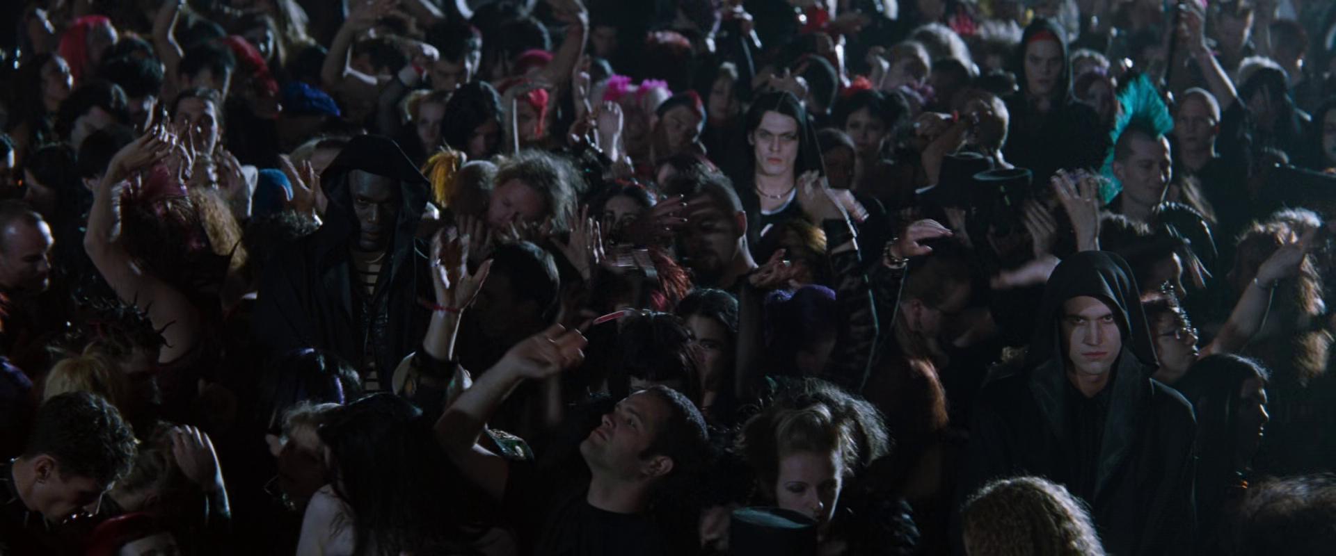 There’s an actual use of CGI here I really enjoyed the first time they deployed it; Lestat is standing out on the stage looking into the crowd of ravers and moshers doing nu-metal Woodstock in front of him and while all the humans are dancing around, they’ve used CGI to insert the vampires who have arrived to kill Lestat in their midst, such that the vampires are flatly lit and unnaturally still in the teeming mass of life. Then they go back to it again but speed the human dancers up and it ruins the whole effect, but hey, you had something there for a second.