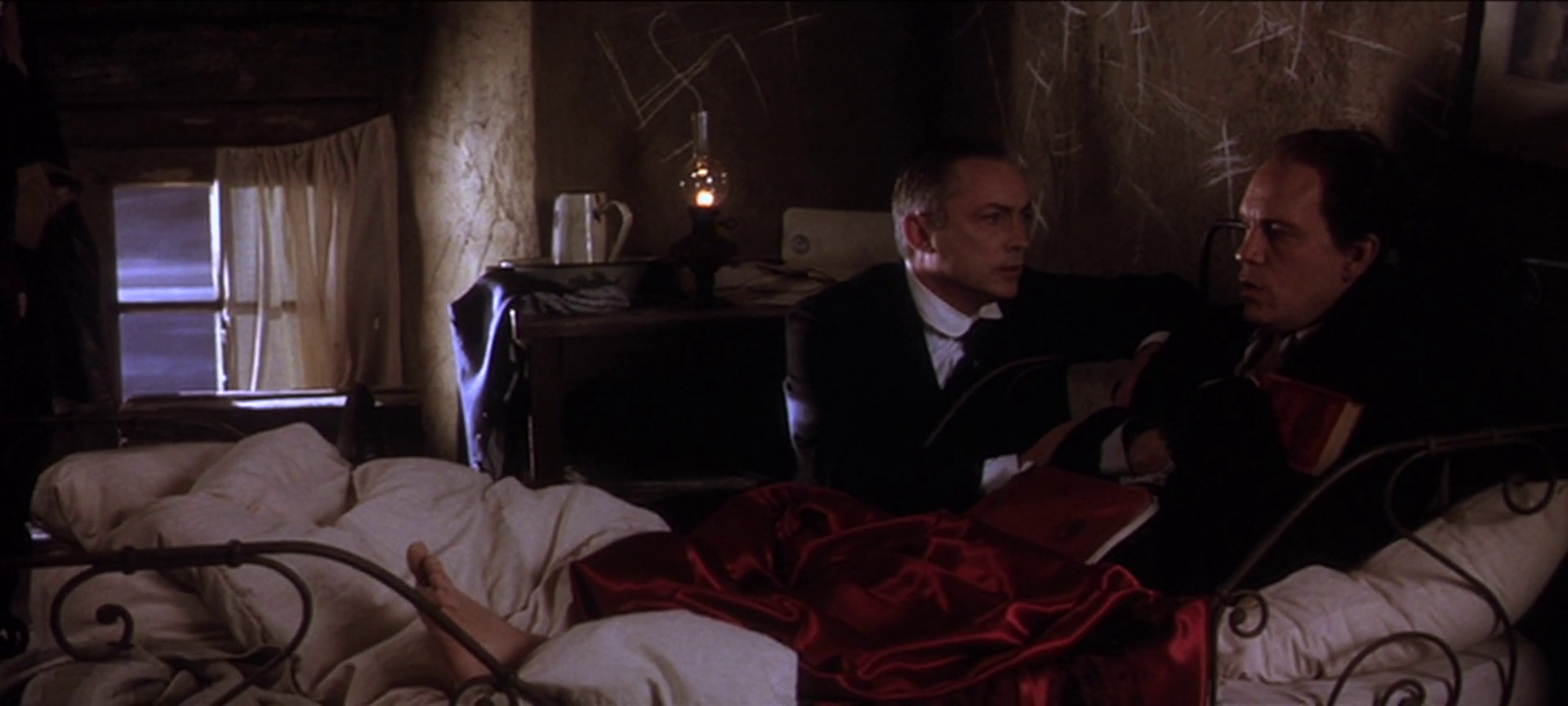 It’s worth noting that this fictionalized portrayal of Murnau is a bit of a dirty deed on the memory of the real man, who was by all accounts pleasant, emigrated from Germany to Hollywood well before the rise of Hitler and the Reich, and died in the prime of his career in a tragic car accident in 1931. This Murnau, played by a Malkovich some ten years older than the real man would have been during the shooting of Nosferatu and with a cartoonish, sinister command of his film set, is a deviant fanatic willing to sacrifice anyone and anything on the altar of his great work. He comes upon Orlock when location scouting for the film and eagerly agrees to a devil’s bargain with the old monster, believing the terms are fully in his favor: Orlock will act in his movie as himself, and in return, he will get Greta. It is unclear when Murnau fully commits to killing everyone involved with the production, including Orlock, if it is necessary to realize his dream -- but he's certainly entertaining the idea before the events of the first scene in the movie, where he lures Greta to her eventual demise with promises of international stardom on the silver screen. Everything after that is just a re-negotiation of terms.
