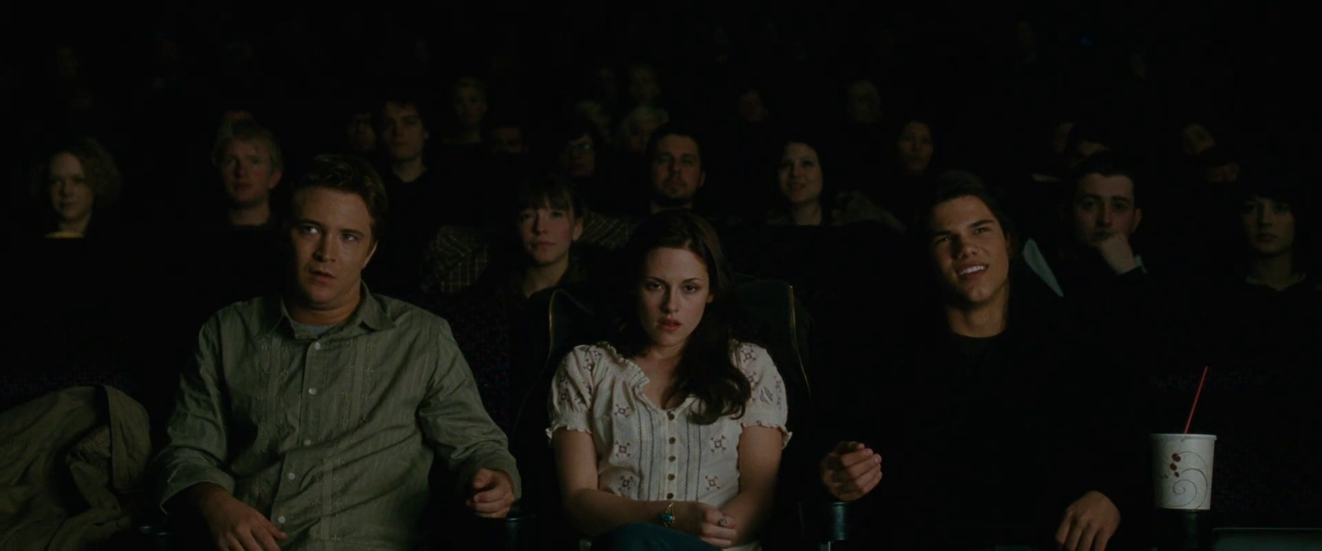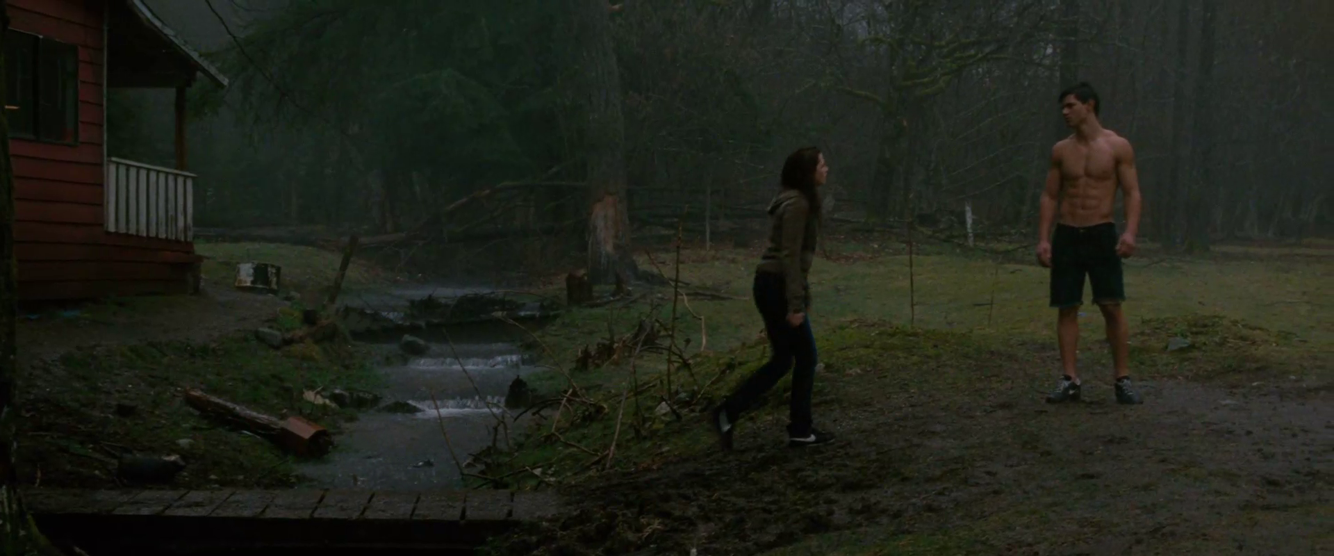 Then some action happens -- Laurent, the one black man allowed in these films, jumps Bella in the woods to try and take revenge for his serial killer buddy’s death at the end of the last movie, and gets torn apart by the werewolf pack -- and Jacob shows up again, shirtless again, in Bella’s bedroom to apologize. What I appreciate about Stewart’s performance of Bella here is that she is not only incredibly distracted by the body transformation that Jacob has undergone (in real life, Lautner put on like thirty pounds of muscle in three months to keep his job, which, again ties into the RS Benedict essay linked just up the page), but she is openly confused by it, brow furrowed, mouth agape, staring at the eight pack. Anyway, in this scene Jacob is pulling another move directly out of Edward’s playbook, which is the ol’ “I wish I could tell you, but you wouldn’t understand!” (At this point she knows werewolves exist, but not that he is one; very silly.) From a werewolf this thankfully comes off as pouty and self-loathing, something that approximates the actual intended effect -- bless his heart, he doesn’t understand just how much kinky monster fic this lady has been reading, and also he’s not real good with words. When Edward pulls this move, it comes off so unbearably condescending it can’t be read as anything other than infantilizing.