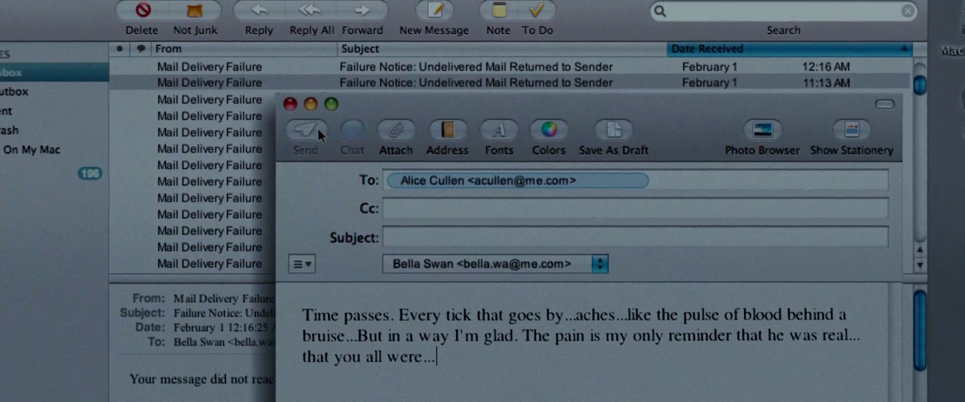 Edward declares that he and Bella Cannot Be Together and the entire Cullen family ups and moves to Europe on that specific whim. Bella goes through her own depressive haze for about six months -- we get a montage of her being basically catatonic from October through December and then her sending e-mails to the Cullens that bounce until it’s spring time again -- and then she realizes, to make a long story short, that whenever she puts her life in danger, a psychic projection of Edward appears to her like the most irritating Force ghost of all time. Given that Bella is already constantly saying, doing, and e-mailing stuff about needing to see Edward again that should be getting her flagged for the school guidance counselor, this immediately creates what’s called a “perverse incentive.”