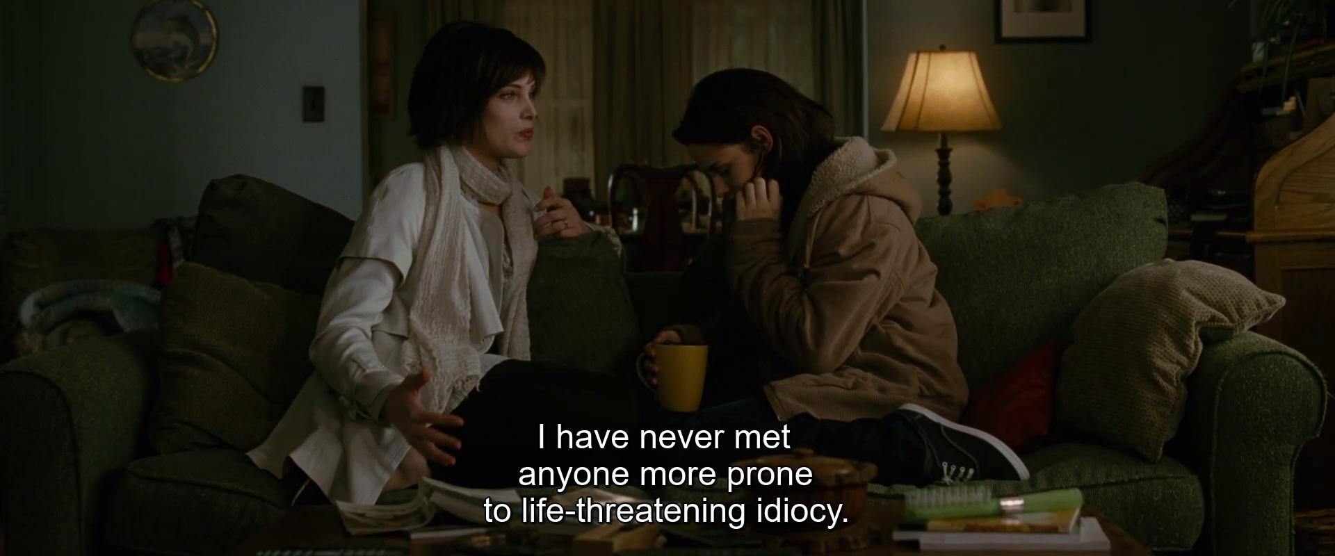 Victoria survives this hunt -- she survives the film, in fact, and will be back in the next installment played by Bryce Dallas Howard -- by fleeing her pursuers, jumping off a cliff into the icy Pacific waters, and never being seen again in this runtime. Seriously, she just shows up, runs around a bit, and vanishes until the next film. Meyer is atrocious at figuring out how to move her plots along and the insistence on fidelity to her work -- which will not last into the final two movies -- is one of the best cases we have for why “Best Adapted Screenplay” is an awards category and why novelists generally aren’t allowed to dictate terms on adaptation. Bella jumps after Victoria into the water -- following Jacob’s clueless rejection of her so he can instead go fail to kill a vampire, this is explicitly a suicide attempt to try to force Edward to take her back, and it is wildly successful -- and I immediately begin to flag on the rest of New Moon.