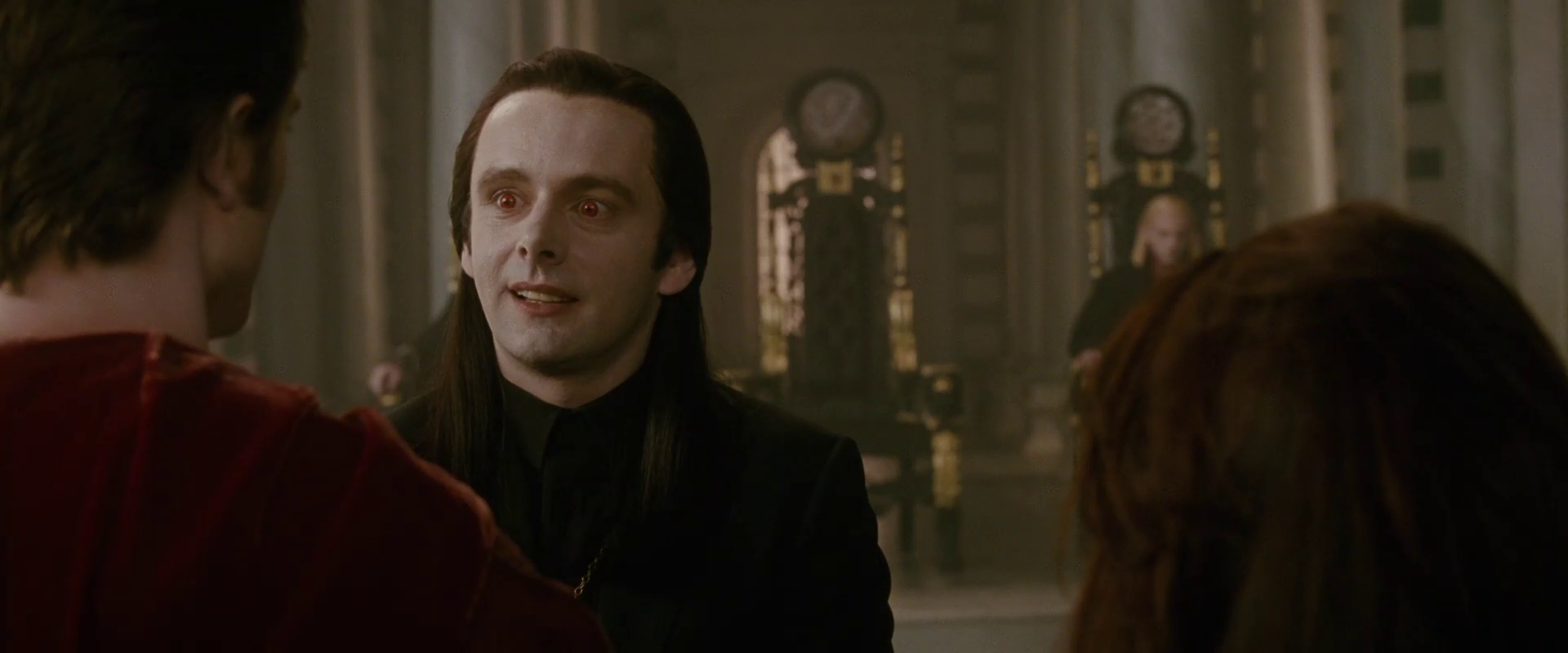 Now that Edward’s family is back in the picture (by means of Alice, who is the vampire that actually flies back to pick her up), suddenly Jacob’s interested, and we get some werewolf and vampire back and forth to remind everyone that in the third movie these two families are actually gonna face off. Then it’s off to Italy for…alright, look. None of this matters, okay. Edward wants to commit suicide by tribunal of vampire elders led by Michael Sheen, but they tell him he’s too cool and they won’t kill him. So he decides to walk outside and glitter in the sun in front of the mortals to force them to kill him rather than betray the Vampire Secret. He’s gonna do this mostly naked so we can get the Robert Pattinson shirtless shot too, because he’s been unable to fulfill his quota offscreen for most of this film. Bella runs into his arms at the last second and stops him; one of the unhealthier relationships covered so far in our journey through, again, vampire cinema is back on.