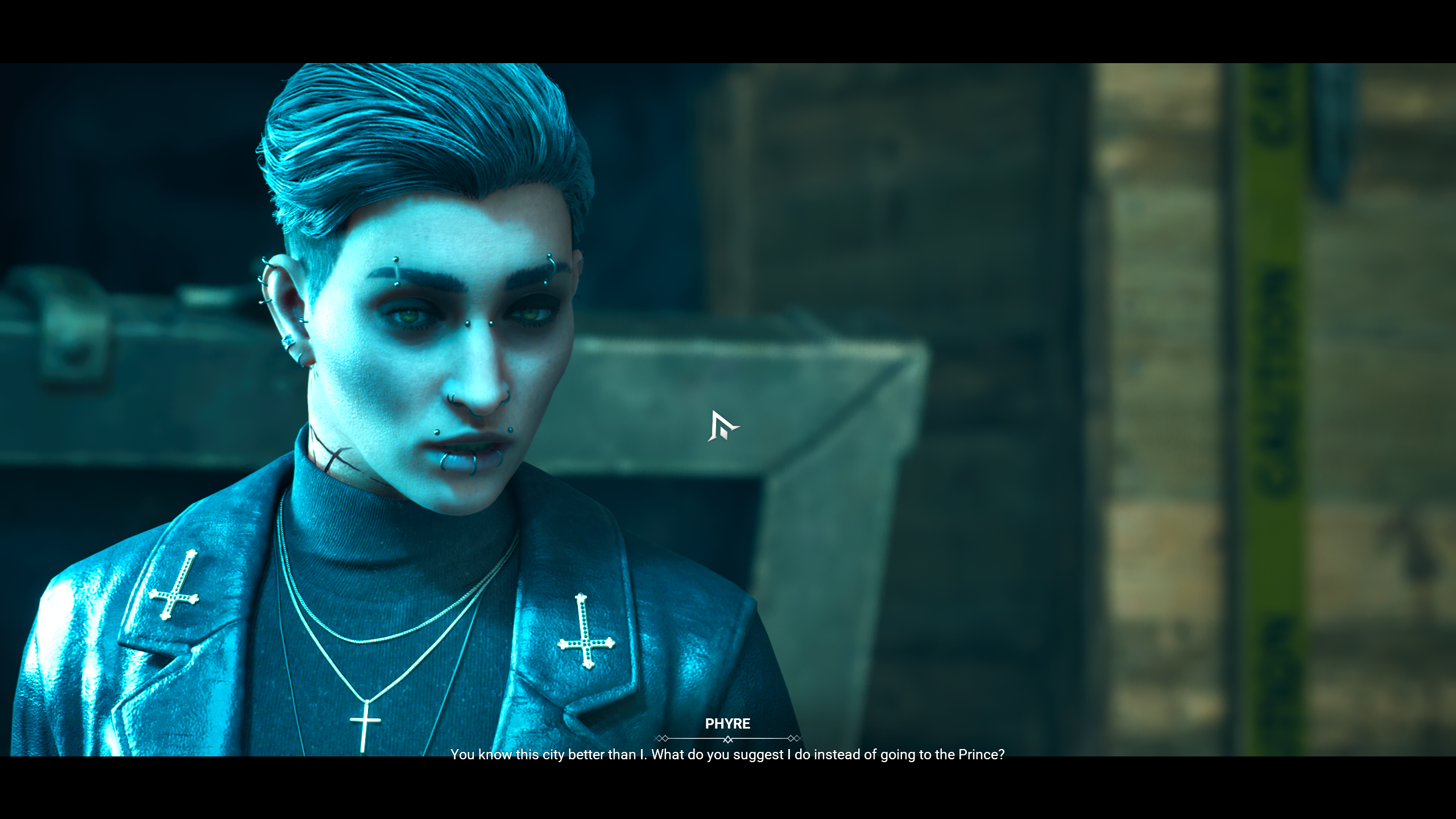 Right out of the gate, here’s one of the limitations everyone who loved Bloodlines is gonna hate, because it’s completely against what Bloodlines was about: You don’t get to choose your character. You are The Nomad, capital T capital N, a vampire elder first recorded in Constantinople in the middle ages who has earned their infamous epithet by wandering the world, something the vampires of the Camarilla very much are not inclined to do (again, very feudal, very petty, very homebody). You are white, you appear to be in your mid-thirties, and you speak English with an accent of Eurasian extraction. You can choose your gender, your hair, your eye color, and that’s about it. Even your given name is locked; shortly after the game begins, a character says they can't just call you The Nomad and asks for a given name -- this is usually where titles like these let you type something in that appears on the character sheet but the voice actors never have to say, like Commander Shepard's first name in the Mass Effect trilogy. But The Nomad looks at a poster on the wall for a local punk act calling itself Phyre and responds, "Phyre," and that's what you're going with.