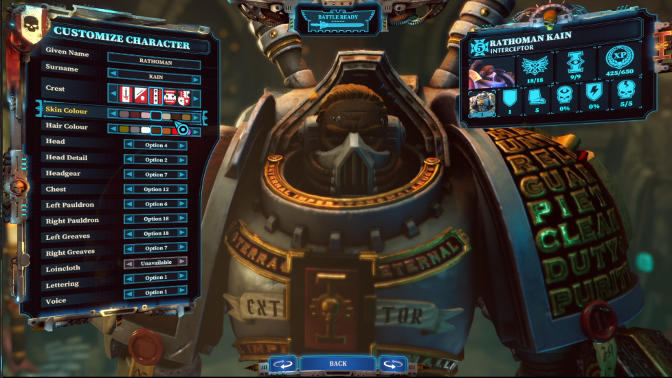 In addition to all the abilities, weapons, and wargear you'd expect, there's a host of cosmetic options available for your dudes. With a broad range of skin colors, hair styles, accessories, and customization on every single piece of armor, each Knight can be truly unique. Each Knight also has a given name and a surname. Their given name can be anything you want, Commander Shepard-style, while their surname is chosen from a list of names you scroll through. These are all nice and Warhammery sounding, and mean that when you click on