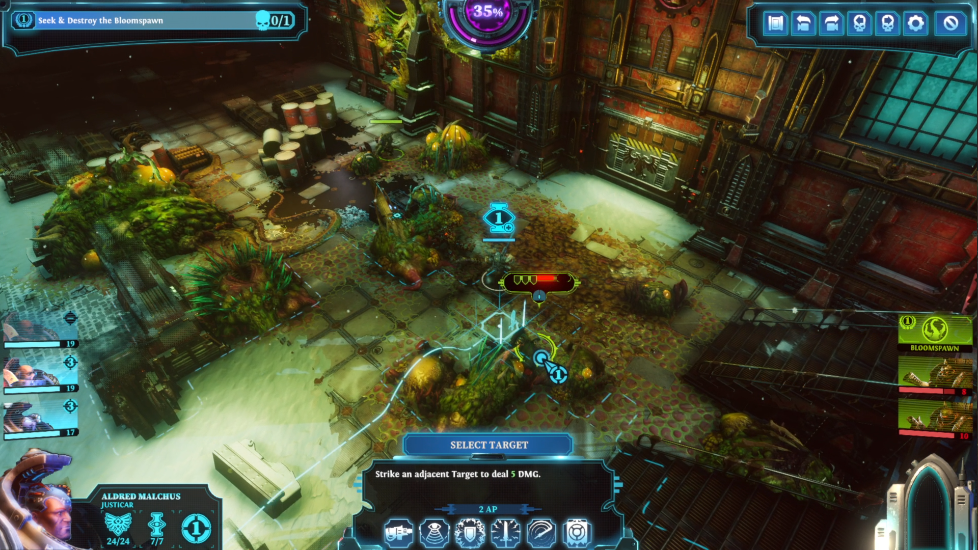 The interface is certainly busy, looking like a gothic'd up XCOM. It looks good, but can get pretty cluttered when there's a bunch of icons for your guys on the left, theirs on the right, buttons in every corner, a Warp Surge meter front and center, and a stack of mission objectives taking up the top left 10% of the screen. I wish that mousing over icons gave you more info and/or a hotkey for them though. I typically play games like this with a keyboard almost as much as I play them with a mouse for comfort reasons, so I would really liked to have known what key to press to end my turn or select my next squad member without digging into option menus.