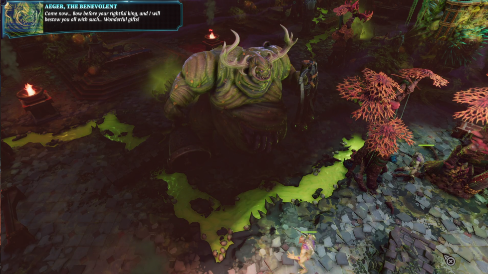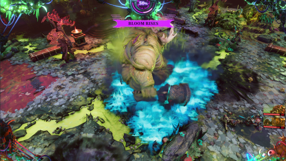 The big boss fight that ended this preview had your team of Grey Knights take on a Great Unclean One, based pretty firmly on the tabletop model. His animations are downright grody, with his guts spilling out and him regularly tugging on his intestines to spill cartoony purple goo on the ground. The twist is that while he shuffles around dropping AOE attacks you need to escape, the environment is laden with hazards and there are hordes of Nurglings being spawned every turn. Instead of acting like normal enemies, these Nurglings cavort about and act more as environmental hazards, slowing down and damaging your guys. It's a race to burn the