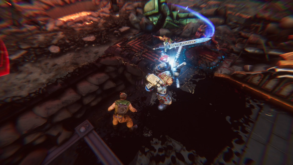 Dawn of War II! It's just that nothing I heard in this preview stood out to me, but it "sounds" like Warhammer, if nothing else. The voicework also hits the mark pretty well, with the vox-distorted bassy voices of the Grey Knights lending each combat bark a memorable quality that would again be right at home in Relic's RTS classics. It's nicely reactive, with my knights shrugging off attacks with "Barely a scratch!" or "Weak!". Voiceover from mission givers was kind of low in the mix, but the performances were solid, about what you'd expect from a stern shipmistress and an even sterner Grey Knight. The Chaos cultist voices are all pretty over the top, and take cues from