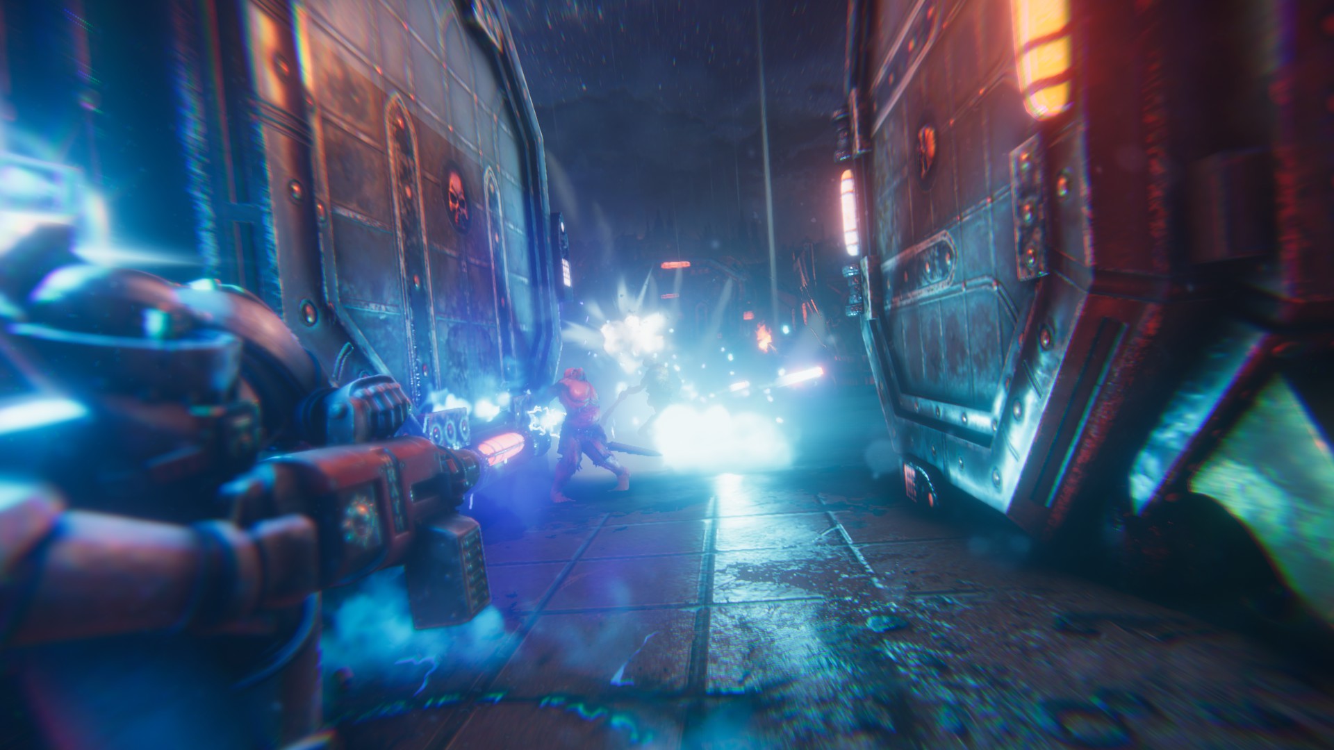 Piñata explosions are kind of the norm here, as enemies usually explode like you're using the Bloody Mess perk in Fallout. As their mortal coils are shed, their platelet counts drop to zero and their muscles turn from solid to gas as every Plague Marine and Chaos Cultist rapidly deconstructs into their constituent parts. It's extremely funny, and the stylized, slightly cartoony visuals bring some levity to what could otherwise come off as pretty gruesome. Those visuals are extremely detailed, with no part of the environment ever falling into the traps of being as generic as "Spaceship Corridor" or "Urban Warzone". Wherever possible, the terrain resembles the modern GW plastic kits to a grimdark T, with the horizons and skyboxes extending into the impossibly huge cities and starships the 40k setting is known for.