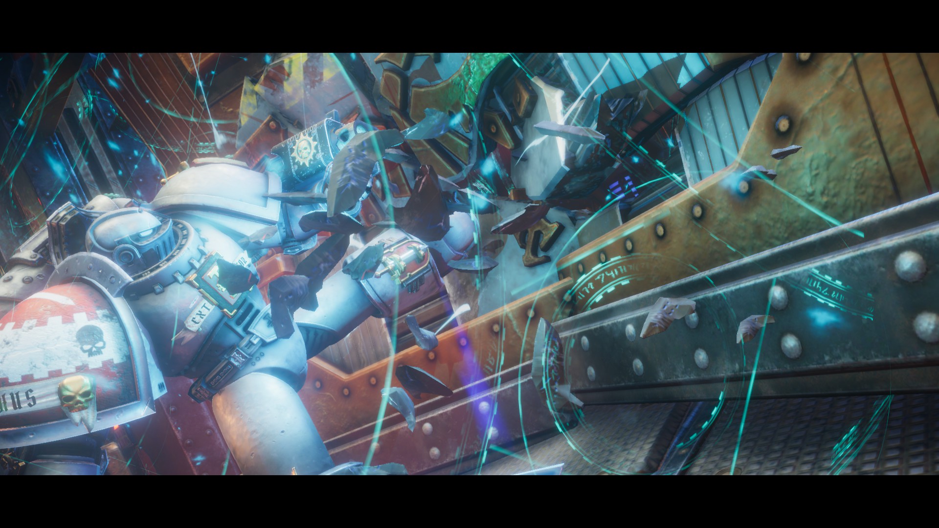 Chaos Gate is instead alive and vibrant in ways that many other entries simply aren’t. It's full of swooping camera passes and cinematic angles on sumptuously-designed sets inside the game’s home base, the Grey Knight Strike Cruiser Baleful Edict, and chaotic, teeming environments in the wreckage and ruins that constitute the title’s battle maps. Warhammer 40K: Mechanicus is probably the game that suffers the most from a quick aesthetic comparison to Chaos Gate; both games and Warhammer 40K: Battlesector are the three big tactical entries to the franchise recently, and while Battlesector is merely as above -- red-armored Space Marines in sand fighting Tyranids whose greens and purples are more subsumed in black-gray chitin than one might want -- Mechanicus faces the Adeptus Mechanicus off against the Necrons, and everything is sort of by-the-numbers but with a lot more green wire-framing. Chaos Gate pops. Chaos Gate has a look. The Grey Knights are running around with English words interspersed on their armor with the usual Latin, which honestly makes a much bigger aesthetic difference than you’d suspect just reading that line -- but when you throw your first grenade and it slow-mos to focus on WRATH written on the side, you start picking up what the game is putting down.