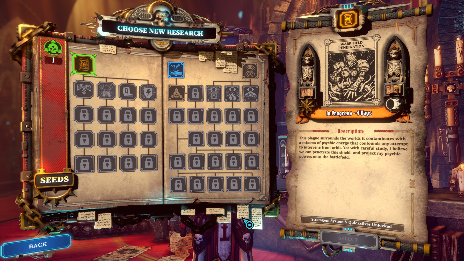 Bernhardt: Veterans of the XCOM reboot franchise put out by Firaxis over the past decade or so will find themselves immediately at home. While Battlesector and Mechanicus admirably tried to distinguish themselves in the small unit tactics space, Chaos Gate is unrepentant about the formula it’s working from. You’ve got a moving home base with a barracks for your persistent, valuable, customizable and individual Space Marines, an engineering lab and research lab (with the proper lore stylings, of course), a mission map with sectors, and missions that generate over time in those sectors while you advance time. Broadly speaking, you’re trying to stop Grandfather Nurgle from plaguing the quadrant, and Nurgle's plague builds up over time as you let mission timers expire. In the beginning of the game you’ll be forced to choose one mission out of two or three, with the other two generating plague before you can reach them. Once you progress in your research and engineering, you’ll have ways to extend mission timers, get to missions more quickly, and in some cases even reverse the plague. At the end of each arbitrary 45 day period, that’s right, you check in with the Chapter Grandmaster and he rates your performance.