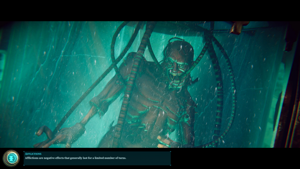 Chaos Gate so clearly is influenced by, each part of your ship has a character standing around a different part of your base of operations. Naturally, that is the Baleful Edict, a massive Warhammery cathedral spaceship. These characters are recognizably distinct from each other, and while the facial animations on the humans are a little stiff, your Techpriest Dominus clearly had a ton of love put into their animation. Every short cutscene of your ship entering the warp or your dudes teleporting to the surface is delivered with aggressive camerawork and a piñata explosion of particle effects. You can't skip these, so it's a good thing they're so cool to look at.