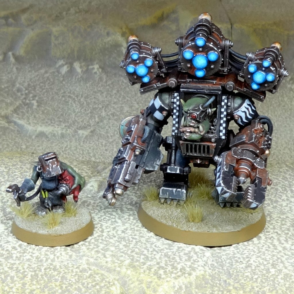 Krom Bignooz and Squigglesworth: Goff Ork Big Mek in Mega Armour with Grot Oiler. Credit: Charlie Brassley