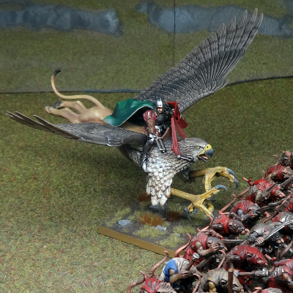 To that end, some greatswords get bulked out from 20 to 28. After that, a new regiment of 30 halberdiers is founded (thanks for the help with those, Drew), and I paint my first ever Warhammer monster despite having been playing this game since 2006. It’s a converted griffon. My desire to paint semi realistic plumage combined with my desire to paint this thing to a high standard has ensured years of sitting on the shelf in nothing but primer, and I realise either the realism or the quality has to go.