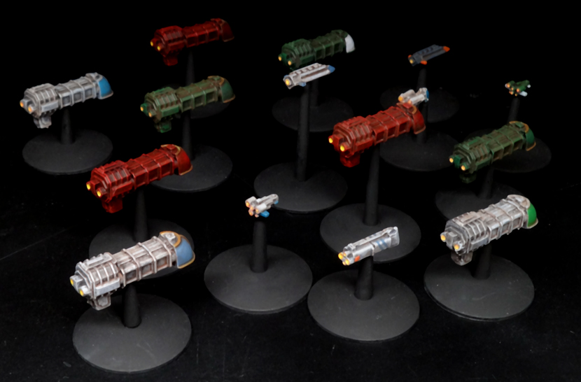 I also needed civilian/merchant vessels. I had some adorable little system ships from the original range, and acquired some more standard transport ships to go with them. These guys formed a scared shoal of refugees for the players to protect and/or use as bait for the Ork invaders swarming the system in the campaign.