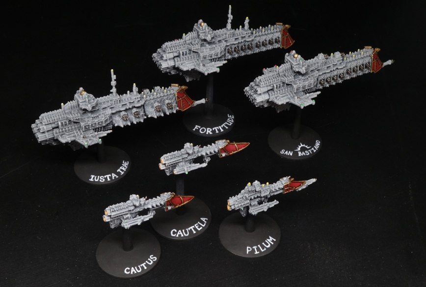 I’ve been running a campaign for my friends Drew and Tom on and off this year, as circumstances permit. This TRAGICALLY involved my having to paint some spaceships for the fleet aspects of the campaign. I have lots of Battlefleet Gothic ships squirreled away, painted dreadfully by my teenage self and crying out for new liveries, so this was a fun bit of renovation. BFG ships are extremely quick to paint, so of course I slowed myself back down by painting the ships' names on the bases.