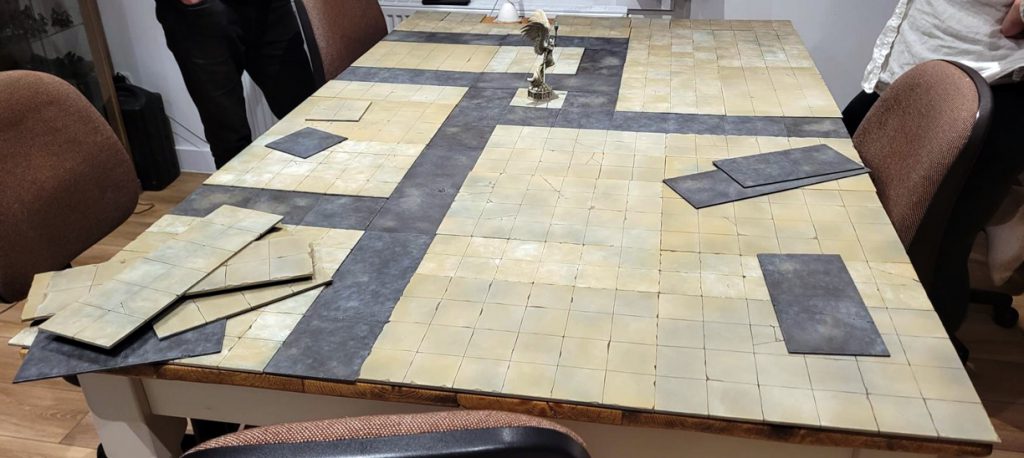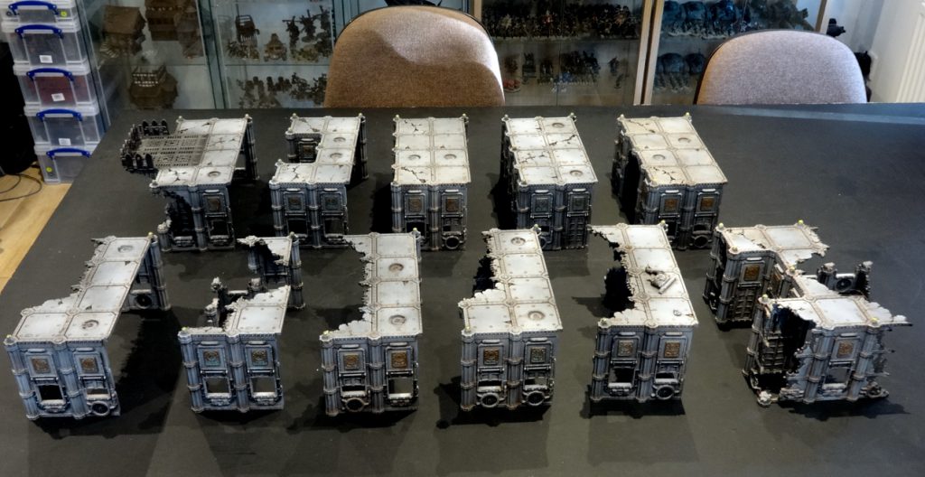 This one’s a team effort, since other members of the Beard Bunker gaming group contributed, but we finally finished our modular urban board: both the modular paving/road tiles for the city, and modular, stackable ruins made from Sanctum Administratus kits to bolster our existing urban terrain. I started this ages ago, but I have a diploma in not getting around to stuff, and teamwork is surely the best way to smash projects like this. I will in time collate all this in a Goonhammer post, but for now, you can