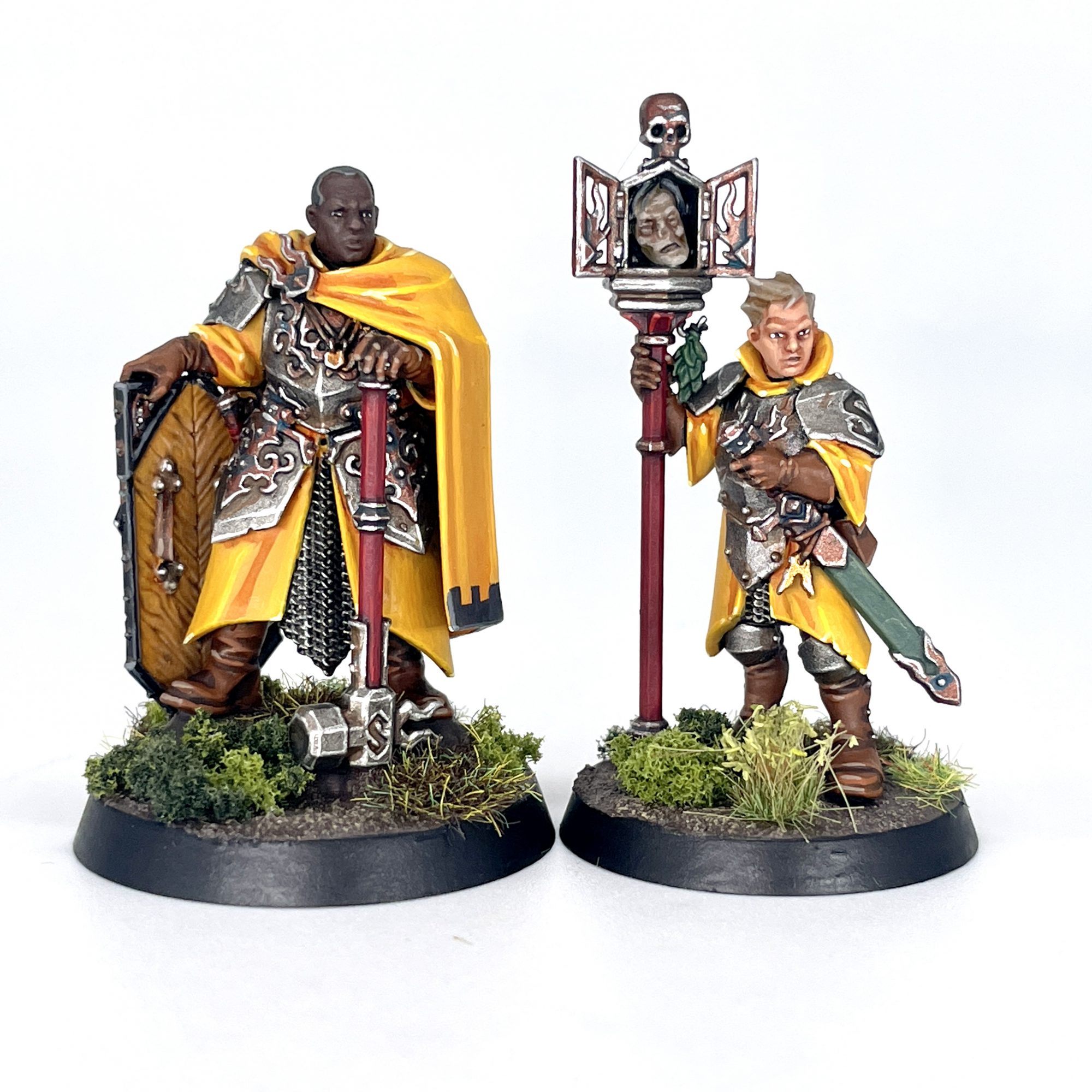 SRM: I started with this pair as they contain most of the textures you'll find across the army - platemail, bare skin, wood, and cloth. Building them both were a breeze, although I had a slight gap in the shoulder of the Marshal's cloak that required some green stuff to smooth over. It was easy enough to leave his shield arm off to paint separately and attach later. I wish there was another option of head or reliquary on the Relic Envoy for variety's sake, as there's loads of head and weapon options on the Marshal. The actual process of painting these models was largely a joyful one. I settled on Greywater Fastness for my force as I've never painted a yellow army before, and the