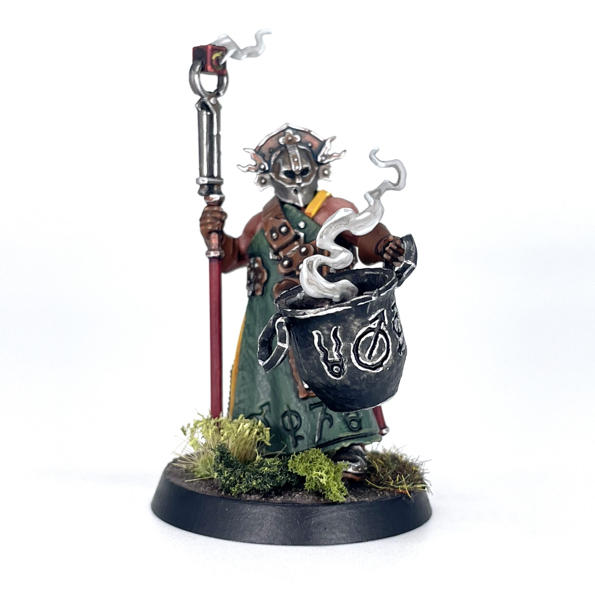 SRM: I tackled this fella at the same time as the Marshal and Relic Envoy. I wanted to see how well my green leather color worked with this model and his big forge apron, and I'm not totally convinced about it. Still, this model was a breeze to assemble, with the only challenge being the unseen magic cube in the cauldron. It's attached to the long smoke trail and is very fiddly to get into position in the pot.