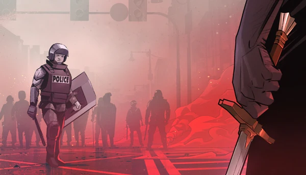 A striking shot of the mix of modern life and legend in the pre-written City of Mist mystery "The Streets Bleed Neon." Credit: Son of Oak Game Studio LLC