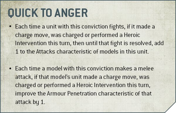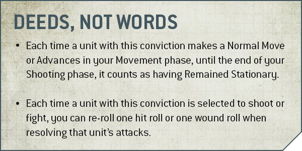 Each time a unit with this conviction makes a Normal Move or Advance Move it counts as having Remained Stationary until the end of your Shooting phase. Additionally, each time you shoot or fight, you can re-roll one hit roll