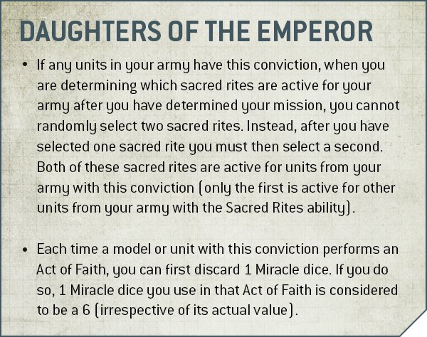 Acts of Faith are now your bonus for being monofaction - you can only gain Miracle dice if every model in your army has the ADEPTA SORORITAS, CULT IMPERIALIS or AGENT OF THE IMPERIUM keyword. No more miraculous soup.