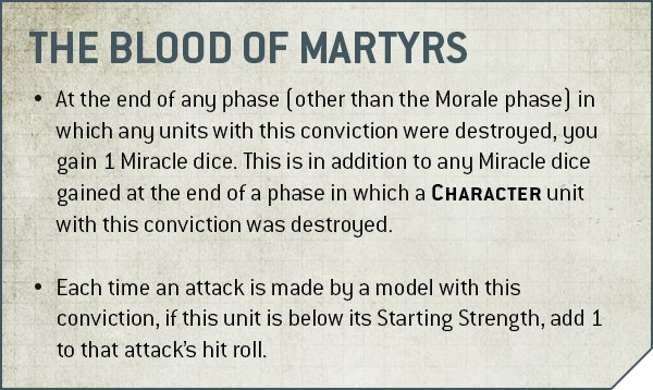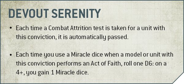 Automatically pass Combat Attrition tests, and every time a unit performs an Act of Faith, gain a Miracle dice on a 4+. A decent trait especially for big blocks, where losing no more than 1 to Morale ever can be potentially helpful, and for keeping Miracle dice flowing.
